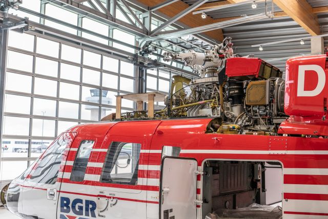 Ein Nahaufnahme eines roten Hubschraubers mit einem Licht darauf.